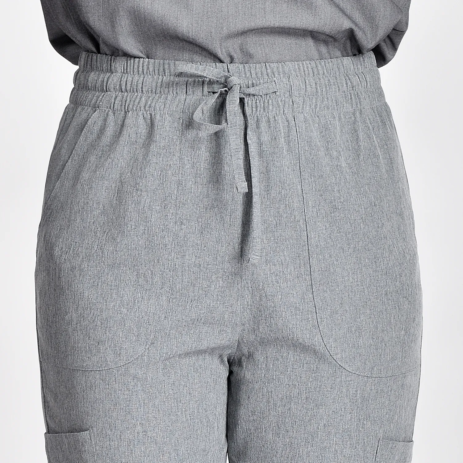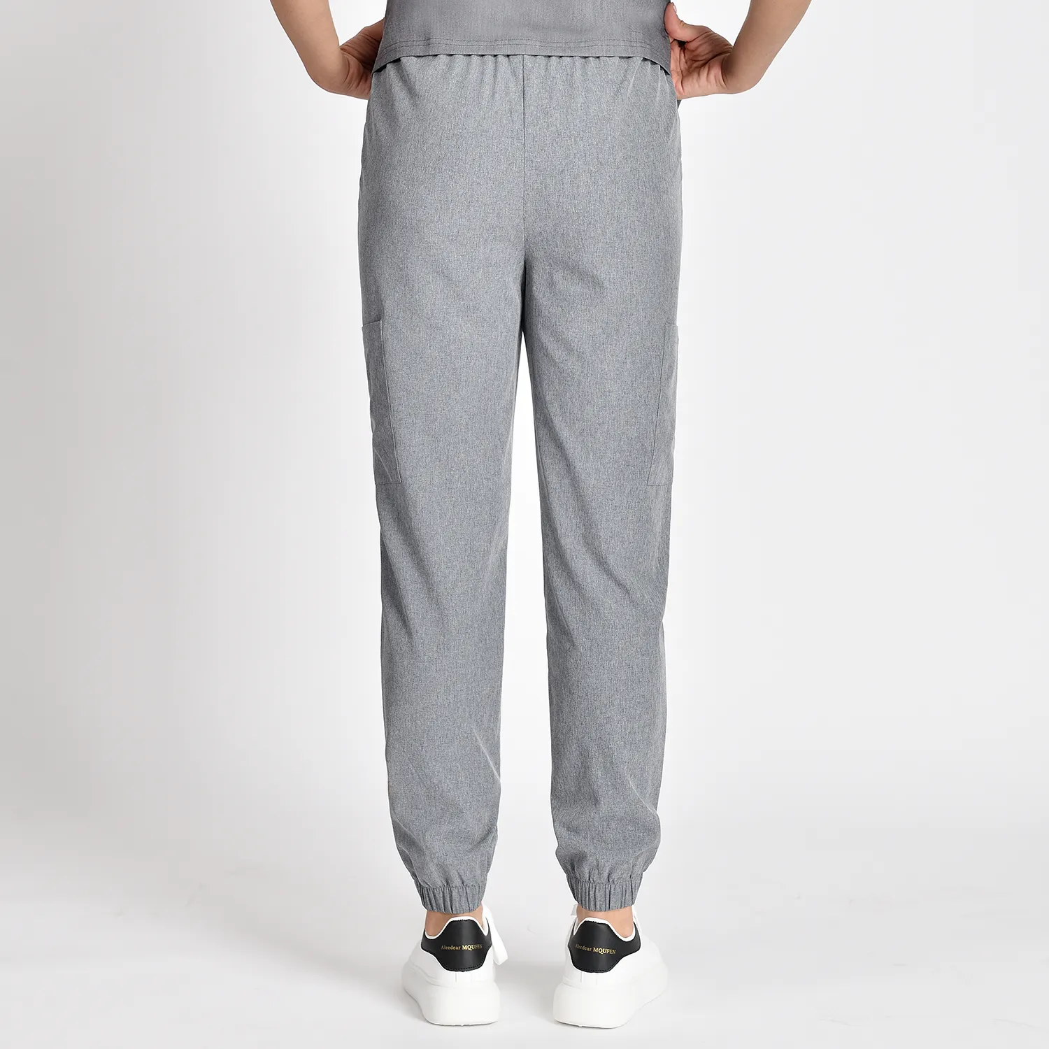 Grey Women’s Medical Scrubs Drawstring Pants with pockets and cuffs, offering comfort and style for healthcare professionals.