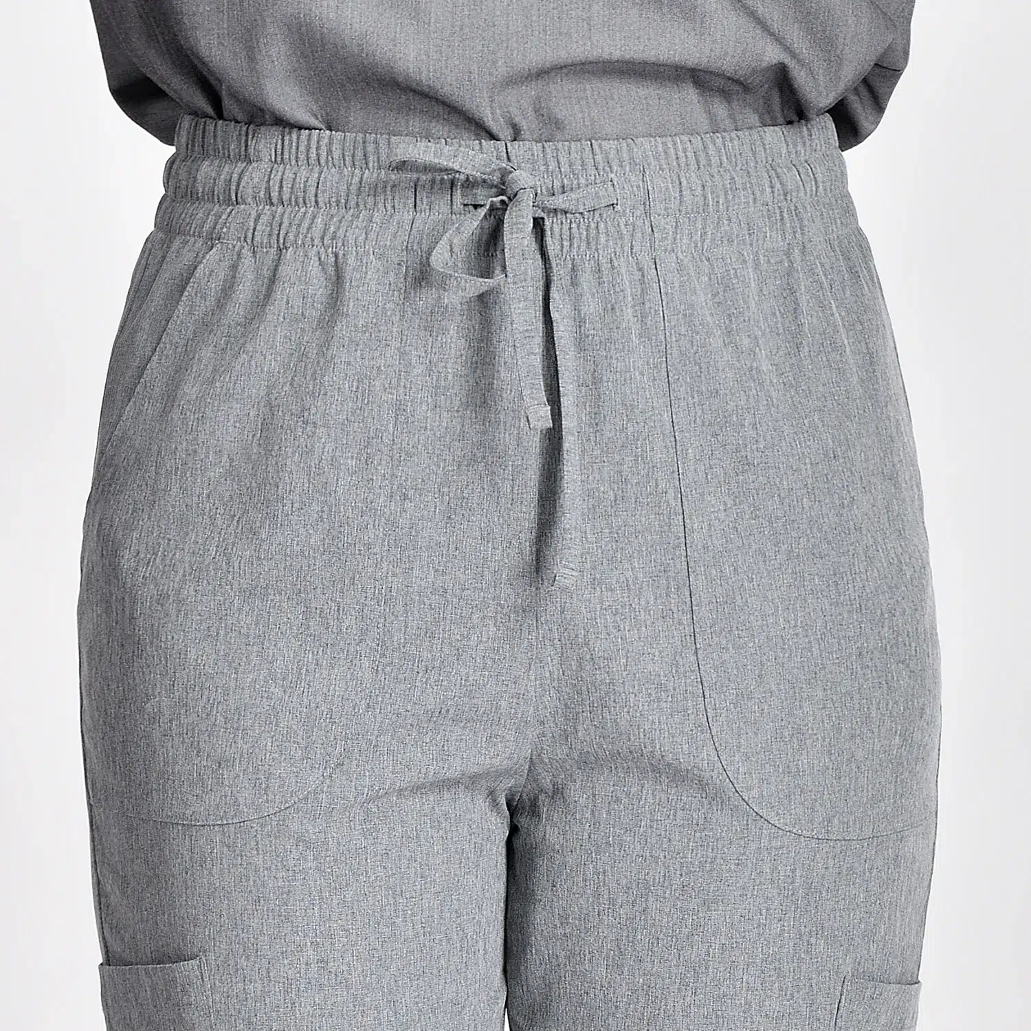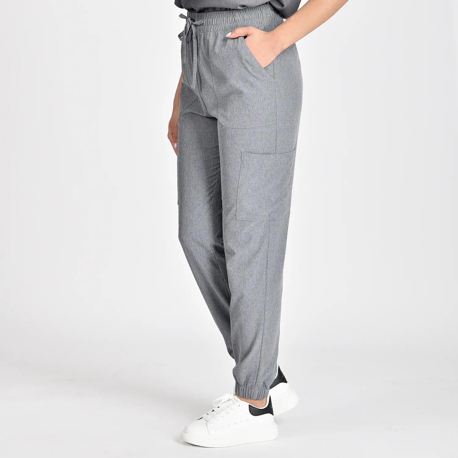Medical scrubs fashion with 4 pockets for small items, drawstring waist, and cuffs at legs.