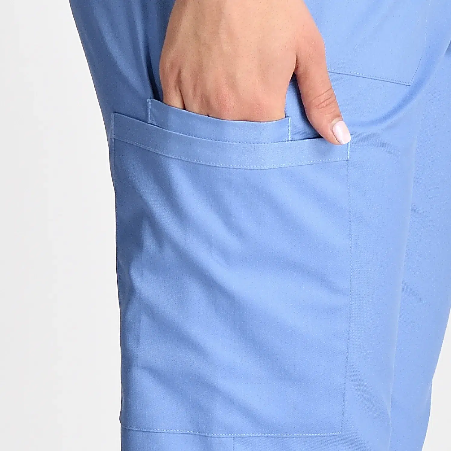 Fashion medical scrubs with 4 pockets for small items, drawstring waist, and cuffs at legs.