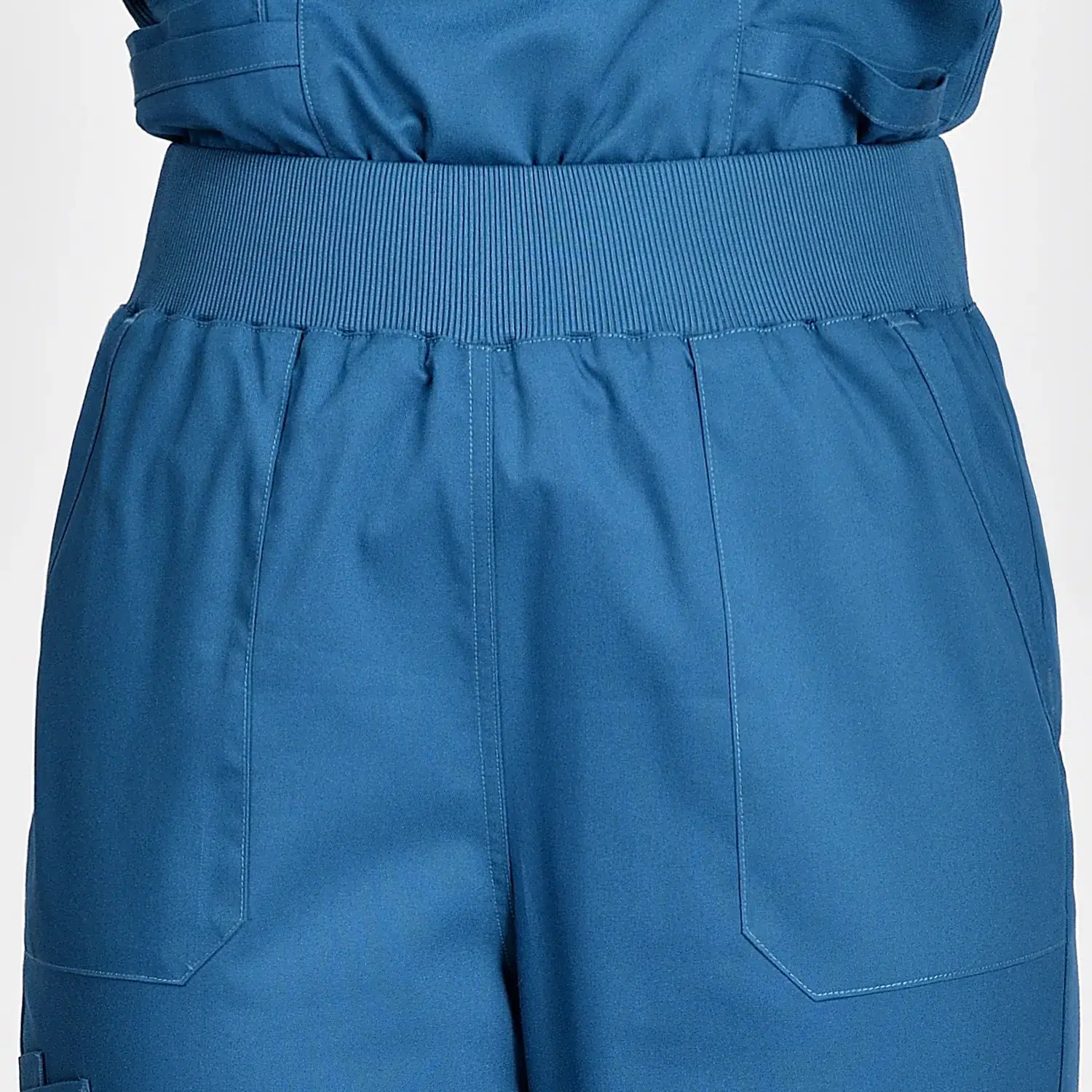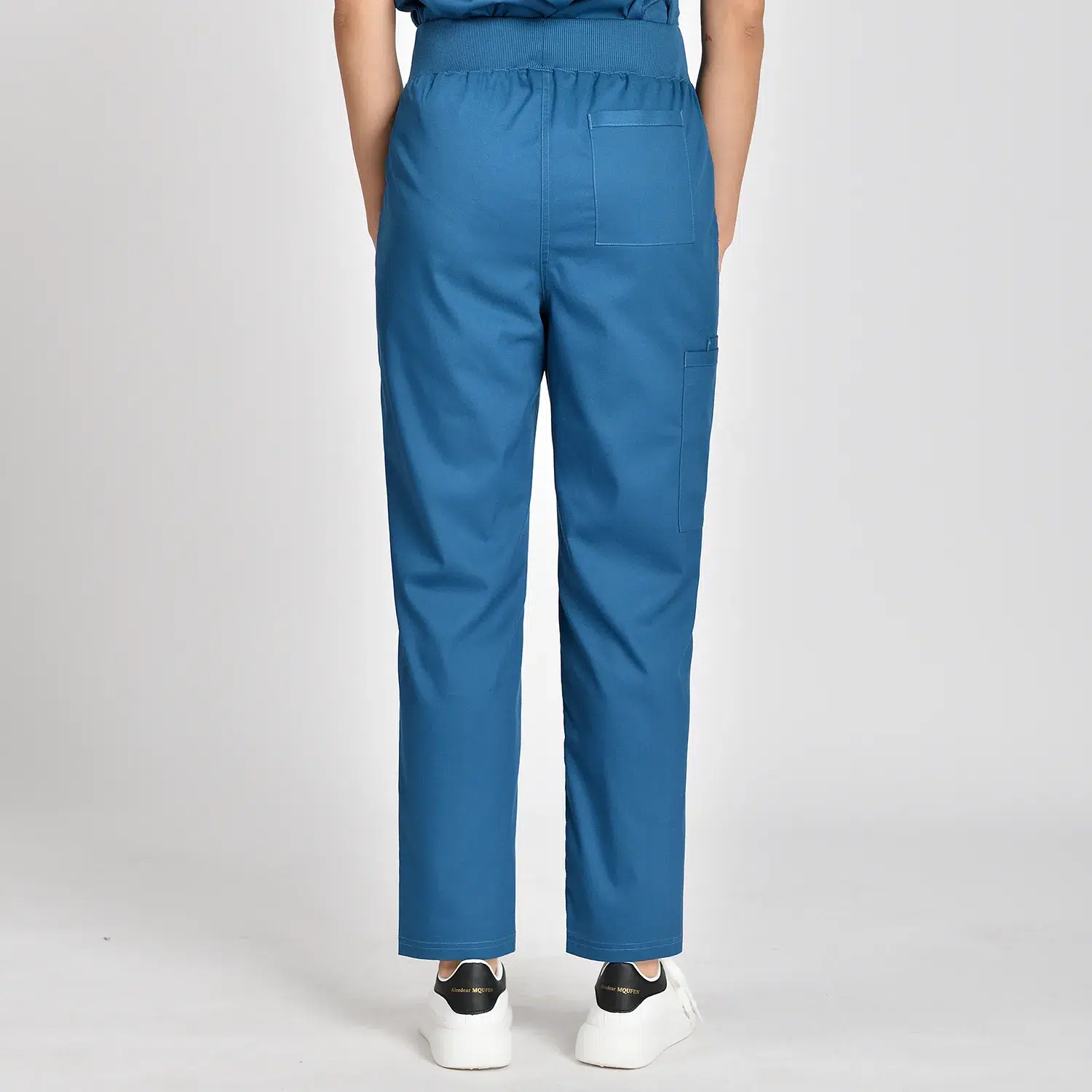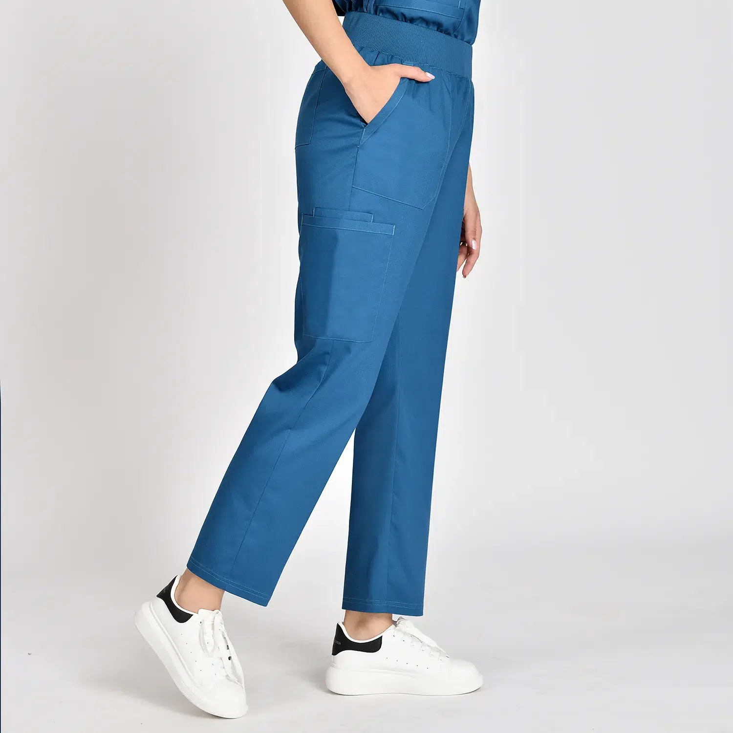Medical scrubs feature 4 pockets for small items, elastic waist, and loose-fitting legs.