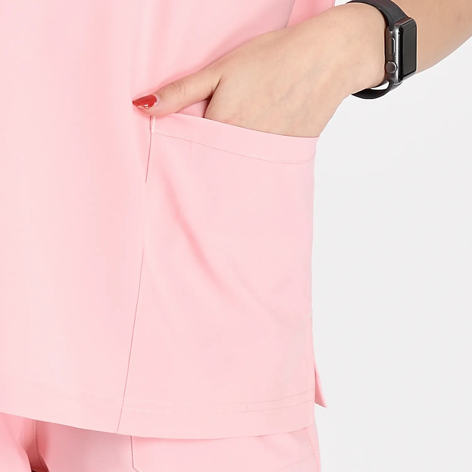 Close-up view of a women's pink V-neck medical scrub top with pockets, offering a professional and comfortable fit for healthcare workers.