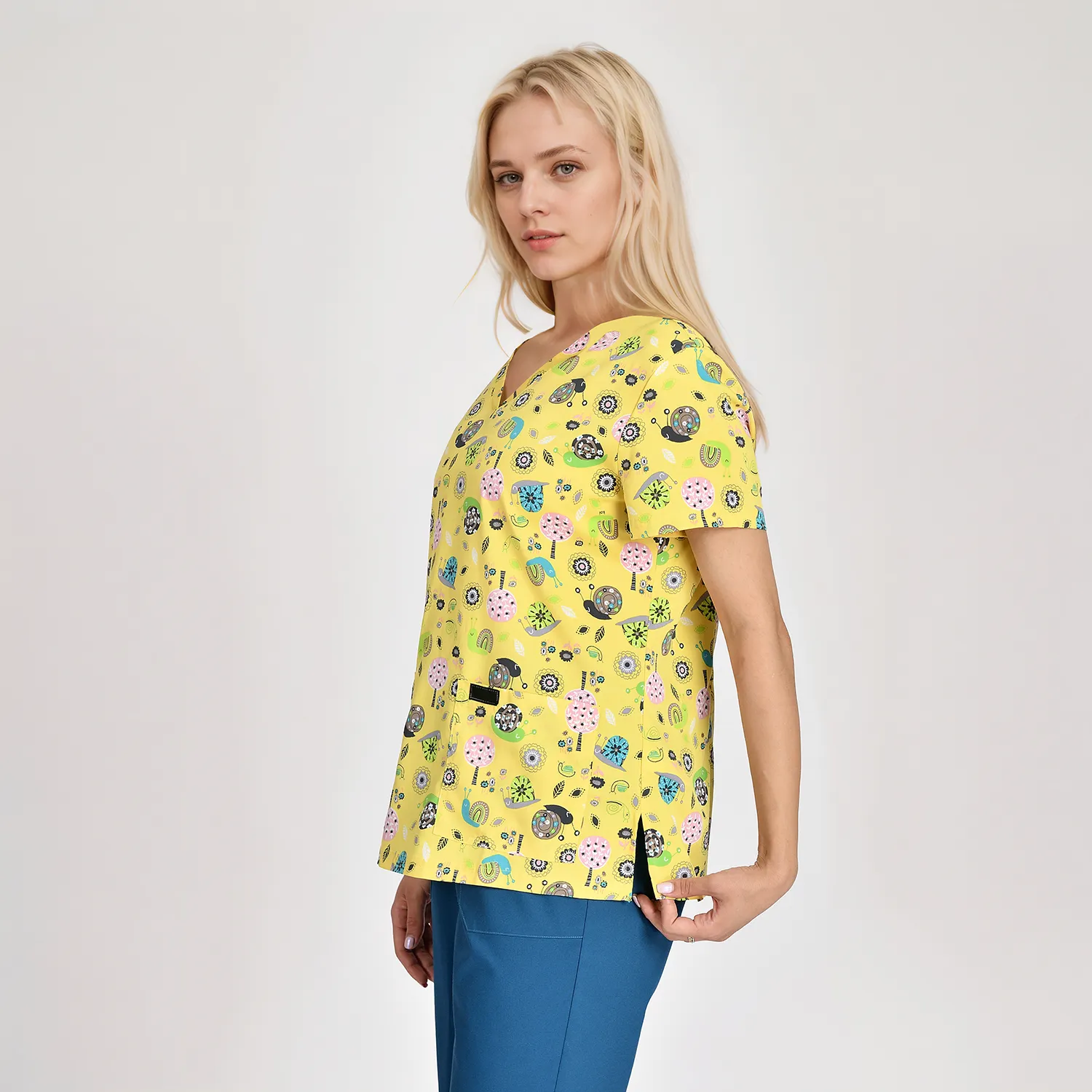 Fashion medical scrubs with 2 pockets for small items, v-neck and short sleeve.
