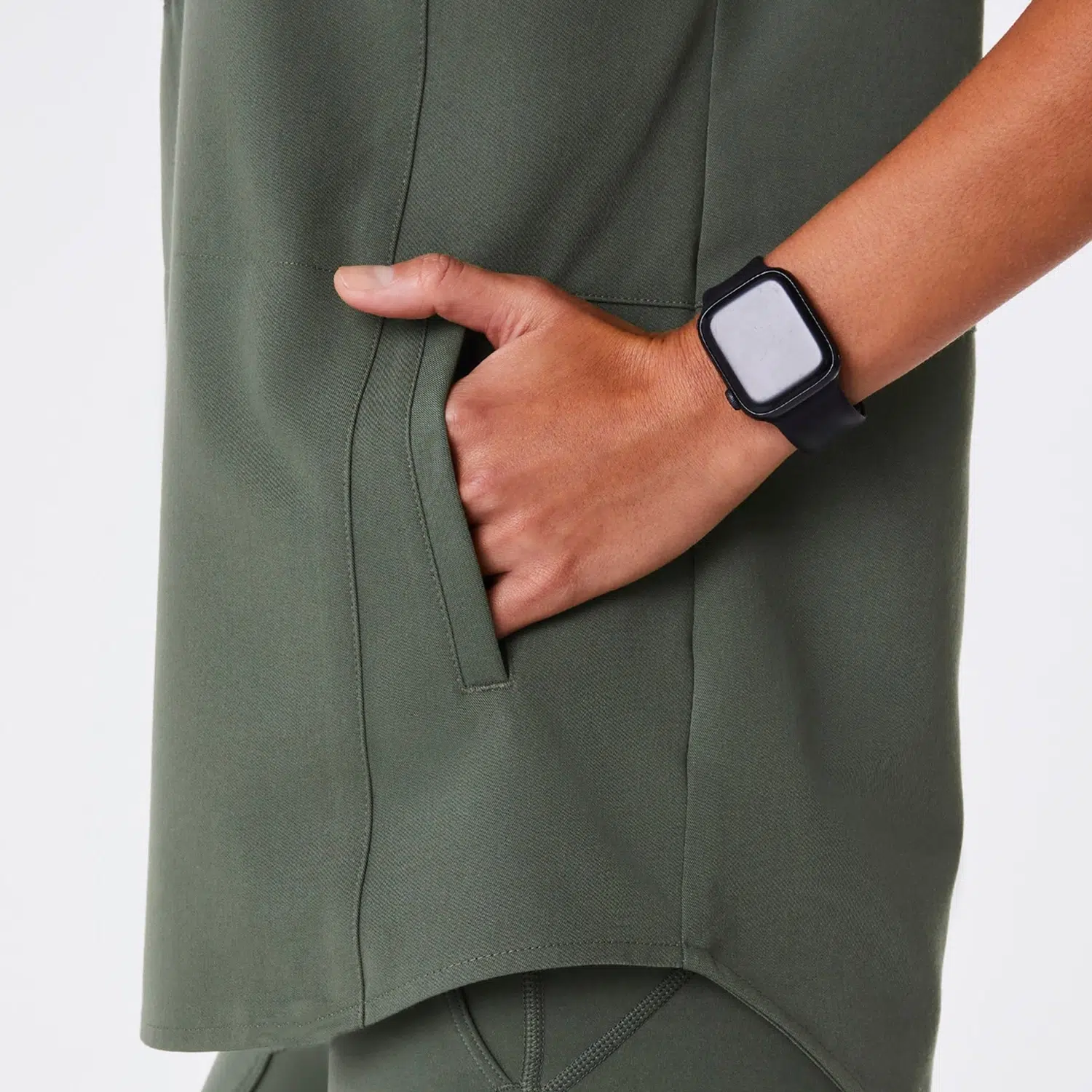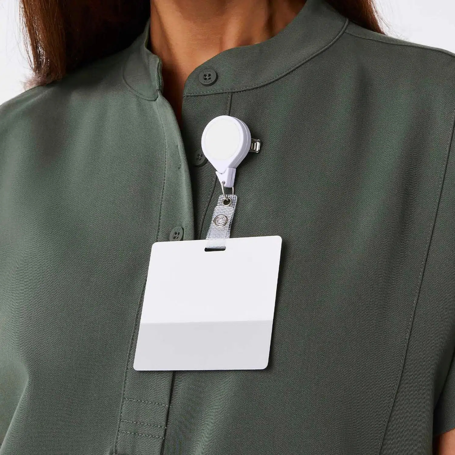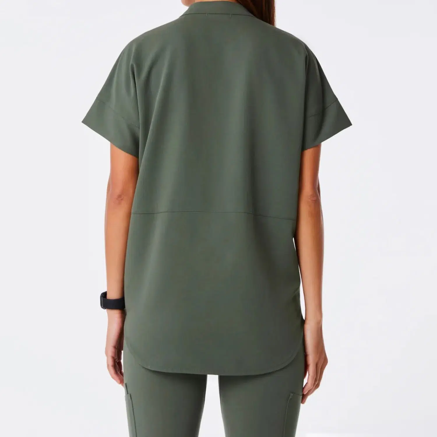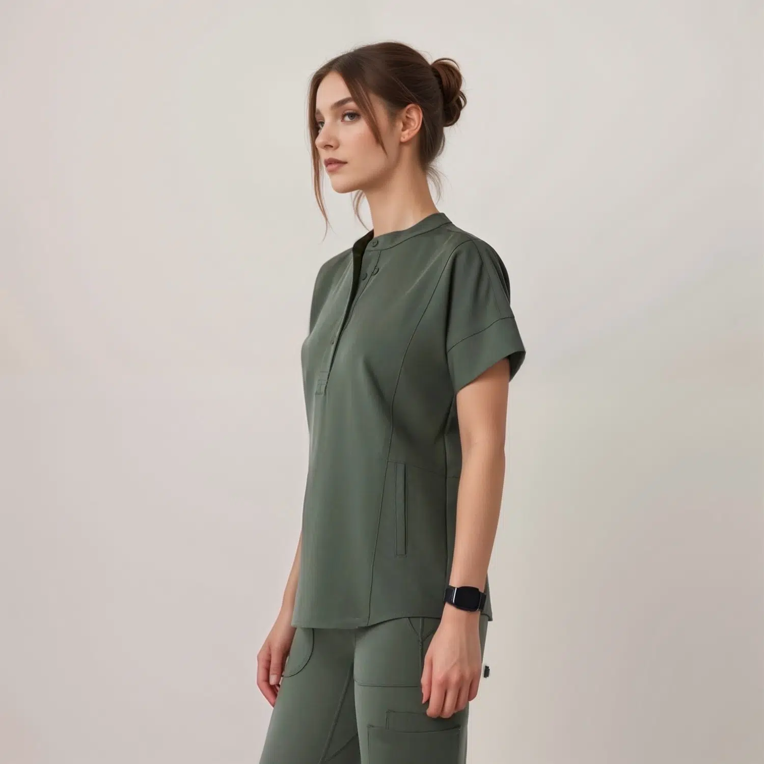 Solid color fashion medical scrubs present a clean and professional appearance.