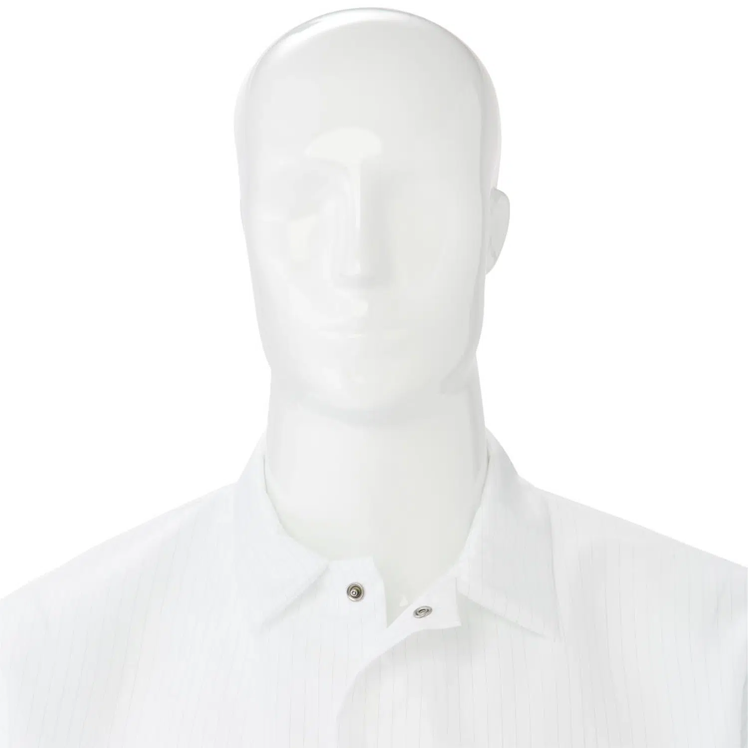 Anti-static lab coats feature breathable, lightweight, wrinkle-resistant, antibacterial, and liquid-repellent fabric with a lint-free finish.