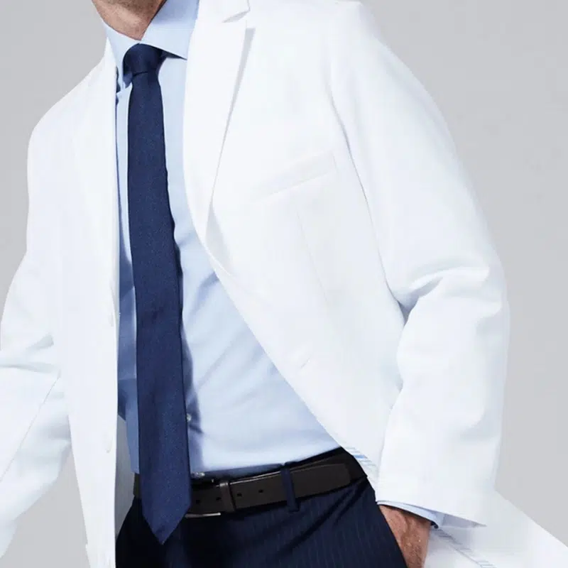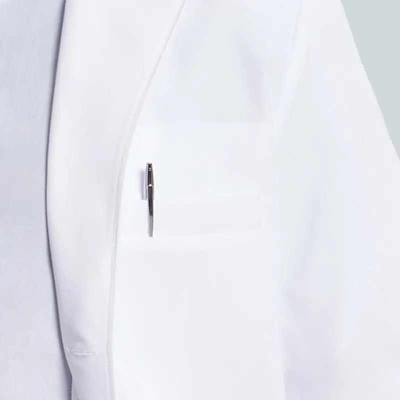 White coat uses breathable fabric with wrinkle resistance, antibacterial treatment, waterproof surface, and strong durability.