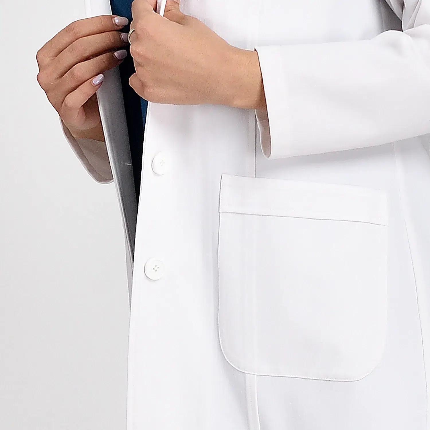 White coats feature long sleeves, notched lapel collar, and buttons for added protection.