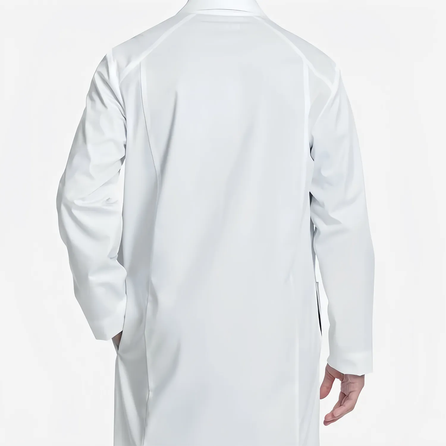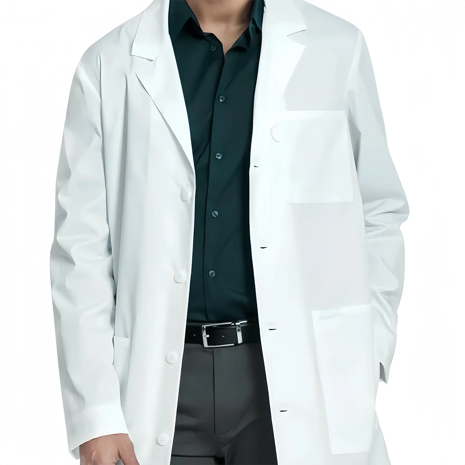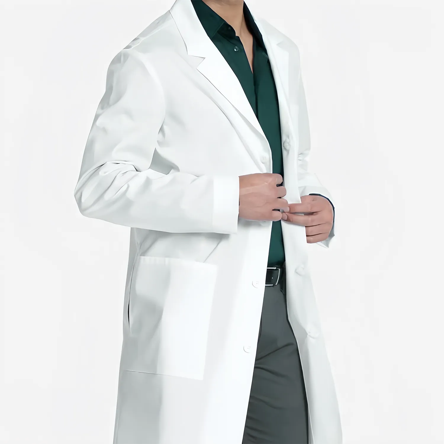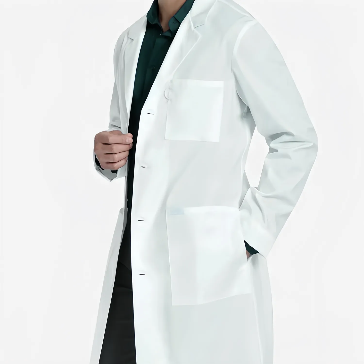 White coats feature long sleeves, notched lapel collar, and buttons for added protection.