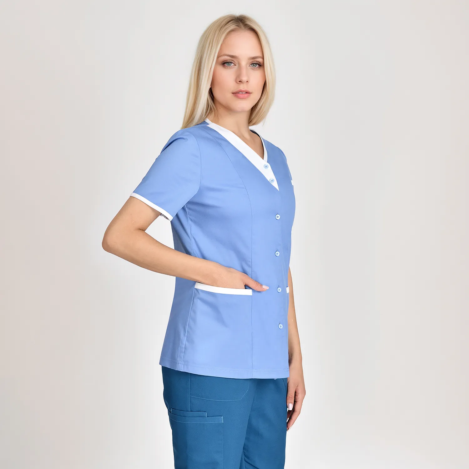 Medical scrubs in classic white and blue maintain a clean and professional appearance.