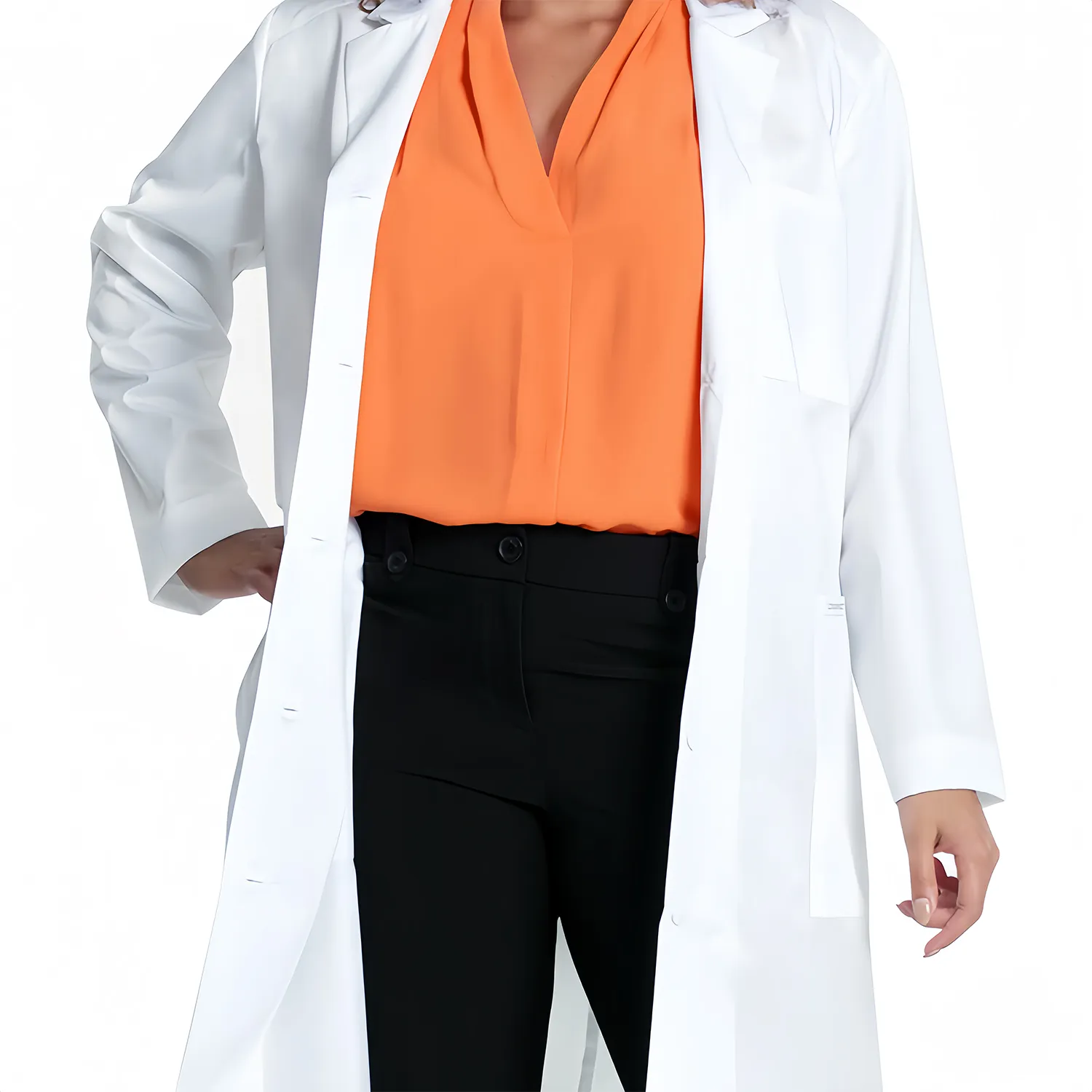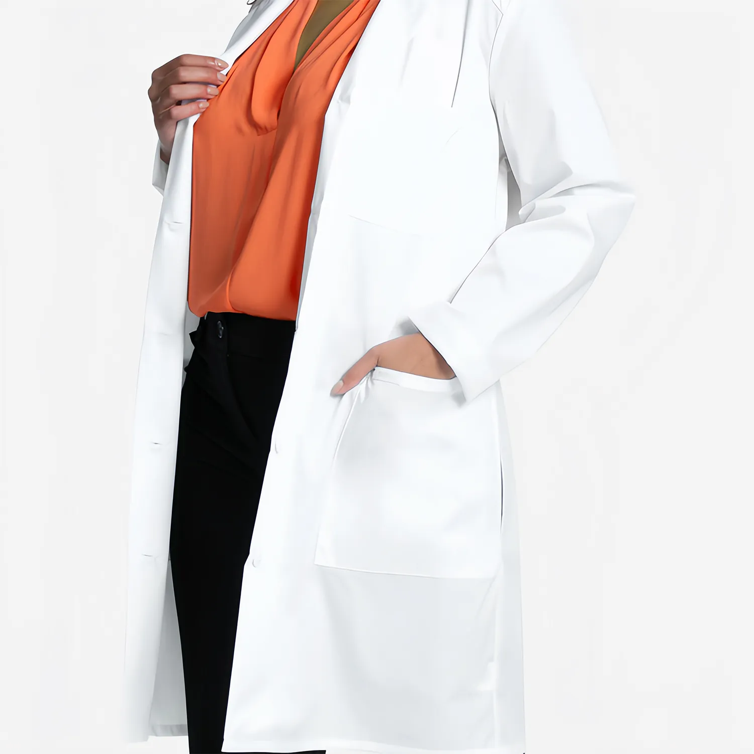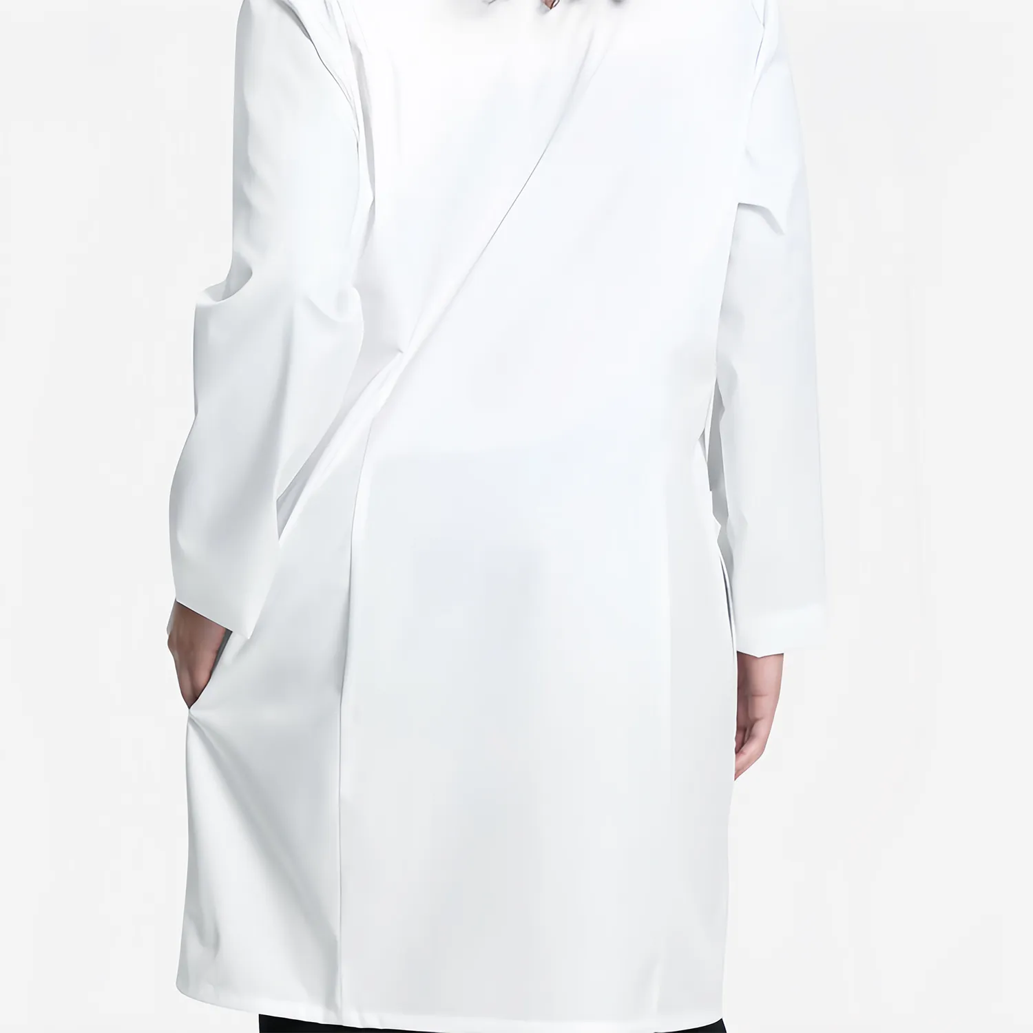White coats feature long sleeves, notched lapel collar, and buttons for added protection.